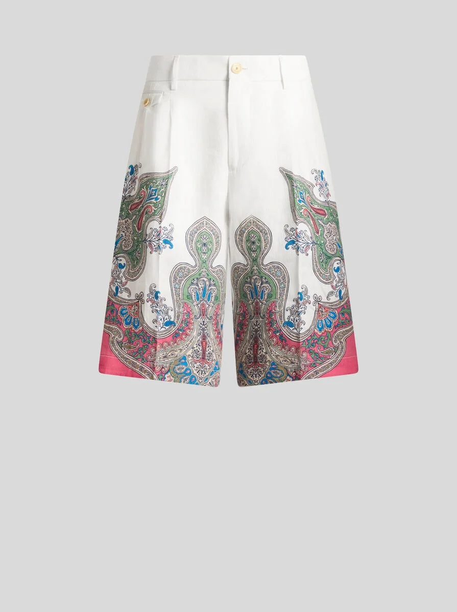 LINEN SHORTS WITH PLACED FLORAL PAISLEY PRINT