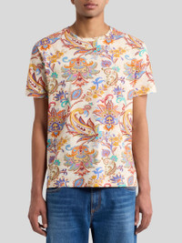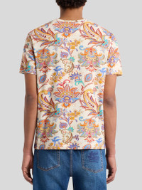 Crew-neck T-shirt in cotton- and linen-blend fabric embellished with all-over floral print. • Roma regular fit • Crewneck • Short sleeves • Made in Italy • The model is 6' 1½" (187 cm) tall and wears a size M PRODUCT DETAILS • 85% cotton, 15% linen