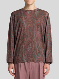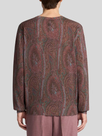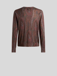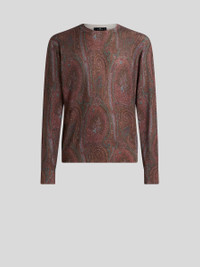 Crew-neck sweater made from a silk and cashmere-blend yarn, featuring an all-over paisley-stamped print. This model is embellished with a tone-on-tone embroidered Pegaso symbol and ETRO logo on the back • Regular fit • Turtleneck • Long sleeves • Fine-rib 1 x 1 trims • Made in Italy • The model is 6’2” (188 cm) tall and wears a size M PRODUCT DETAILS • 55% silk, 45% cashmere