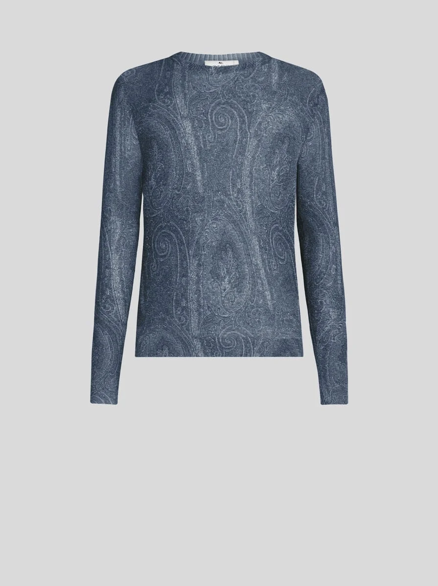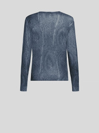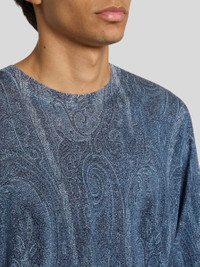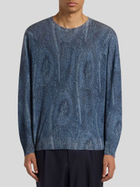 Crew-neck sweater made from a silk and cashmere-blend yarn, featuring an all-over paisley-stamped print. This model is embellished with a tone-on-tone embroidered Pegaso symbol and ETRO logo on the back • Regular fit • Turtleneck • Long sleeves • Fine-rib 1 x 1 trims • Made in Italy • The model is 6’2” (188 cm) tall and wears a size M PRODUCT DETAILS • 55% silk, 45% cashmere