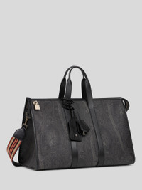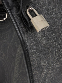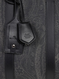 Travel bag in iconic Paisley jacquard fabric with striped shoulder strap, two handles and leather trims. This accessory is enhanced by its removable metal padlock and two removable tags: one with Pegaso logo and the other with Etro lettering. This bag is perfect to carry by hand or worn crossbody. • Dimensions (Width, Height, Depth): 17.7 x 12.2 x 9.4 inches (45 x 31 x 24 cm) • Internal zip pocket • Zip closure • Two short handles • Shoulder strap • Removable tags • Removable padlock • Golden-finish metal accessories • Made in Italy PRODUCT DETAILS • Exterior: Paisley jacquard cotton fabric coated with matt texture and lined with canvas • Coating: 100% PVC • Detailing: 100% leather • Ribbon: 95% polyester, 5% polyamide • Lining: 50% polyurethane, 50% polyamide