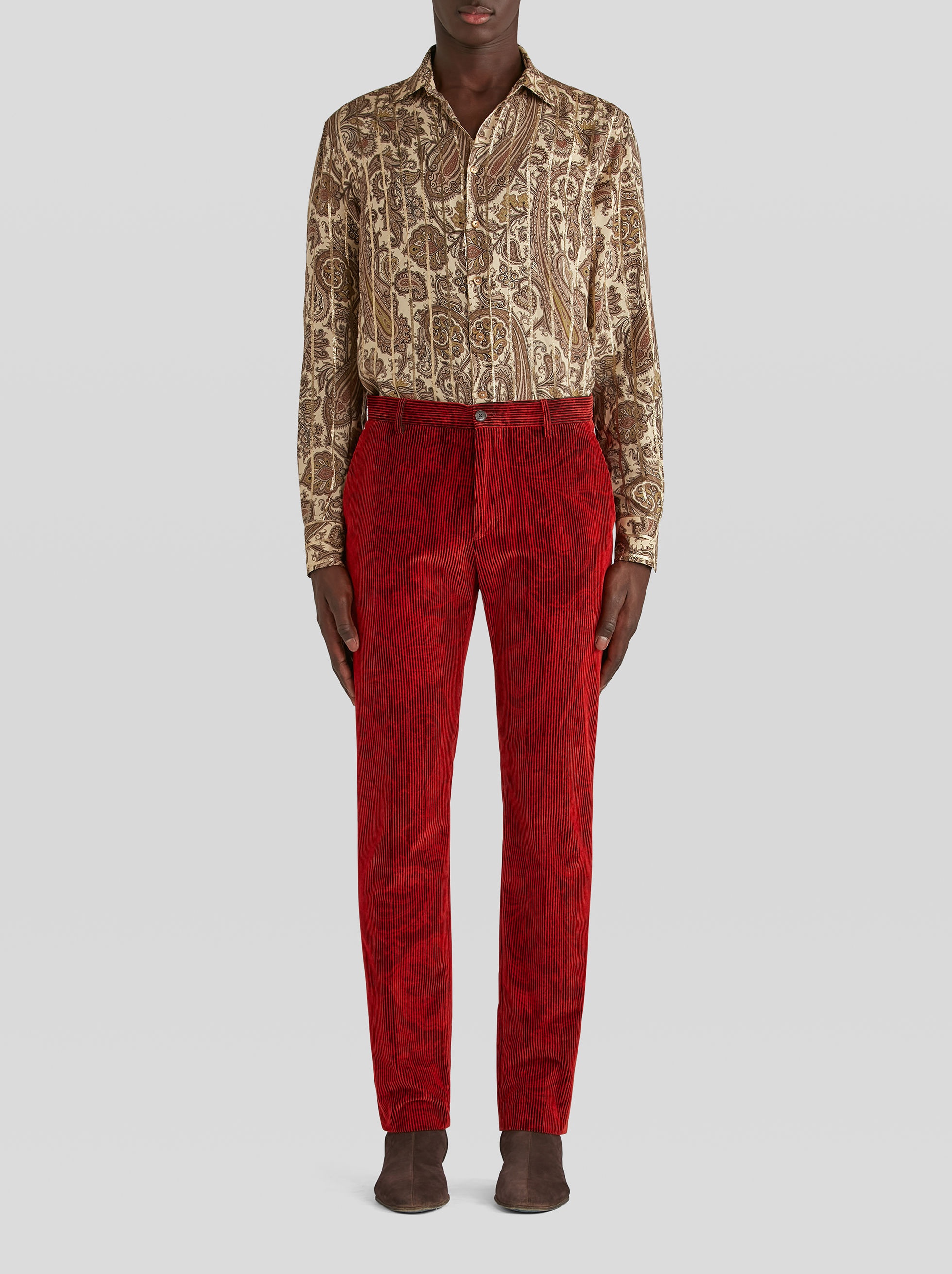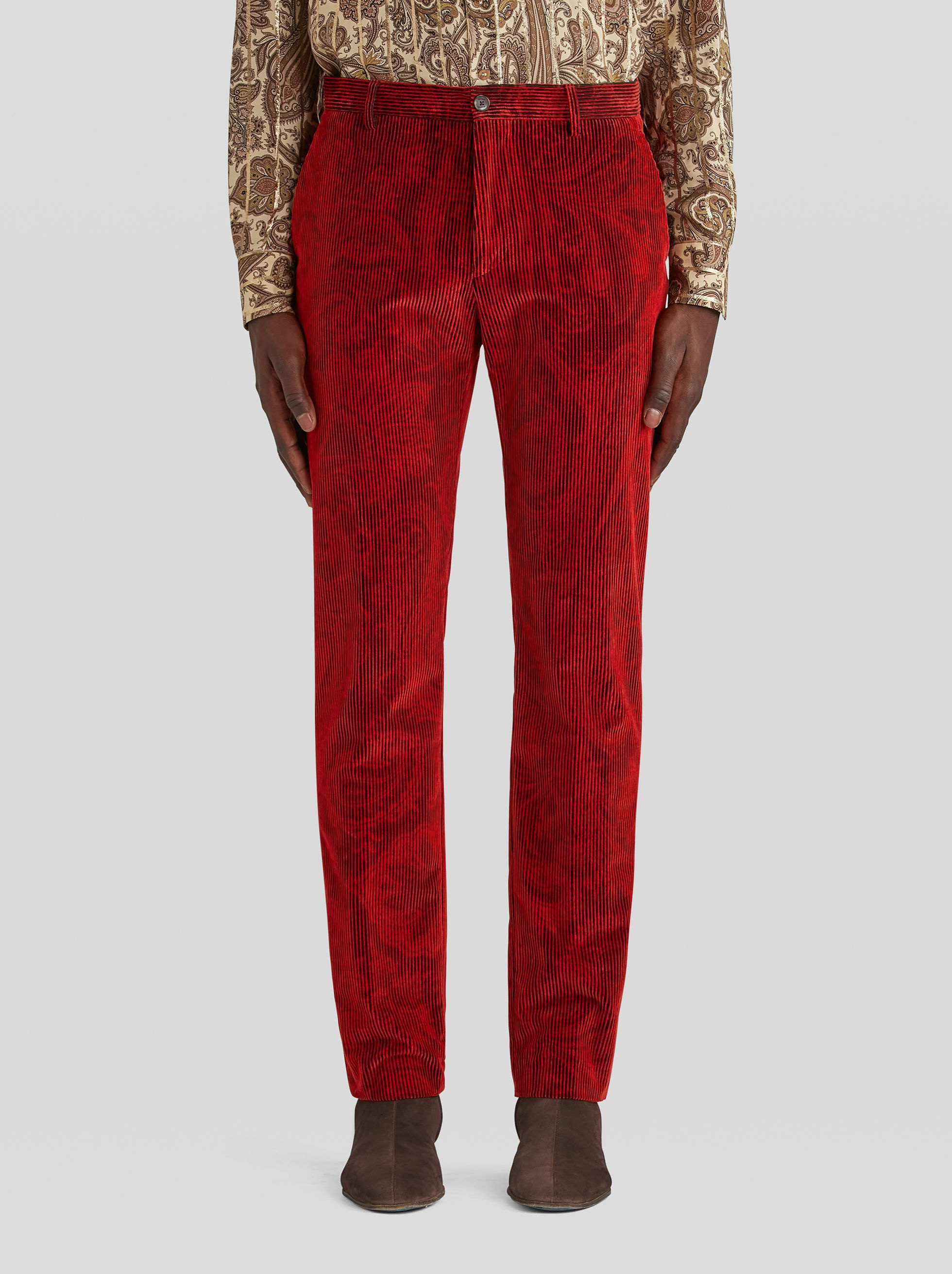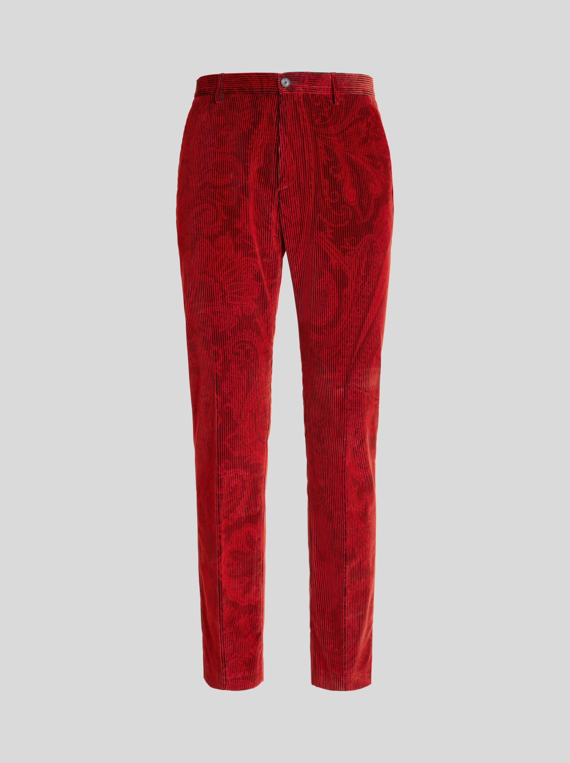 Cotton corduroy tailored trousers with all-over background Paisley printed patterns. PRODUCT DETAILS • 100% cotton • Slim fit • Button and zip with flap fastening • Slant pockets • Piped rear pockets • Horn buttons • Leg bottom 19 cm • Made in Italy • The model is 188 cm tall and wears size 48 Sku: 222U1W71502020750