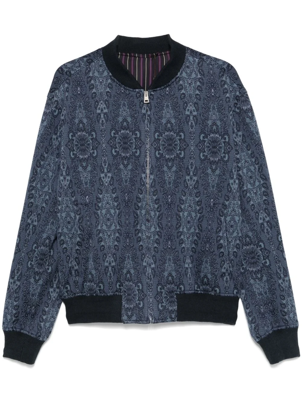 patterned-jacquard bomber jacket Highlights - Navy blue - Front zip fastening - Baseball collar - Two press-stud fastening side pockets - Ribbed cuffs and hem Imported Composition Lining: Viscose 53%, Acetate 47% Outer: Cotton 46%, Polyester 36%, Viscose 15%, Polyamide 2%, Elastane 1% SIZE & FIT Model measurements Height 6 ft 2 in(1.87 m) Bust/Chest 38.18 in(97 cm) Hips 36.61 in(93 cm) Waist 29.13 in(74 cm) FittingInformation Designed for a regular fit, allowing for a comfortably loose fit throughout the body The ribbed hem offers a close, comfortable fit Made from a midweight fabric
