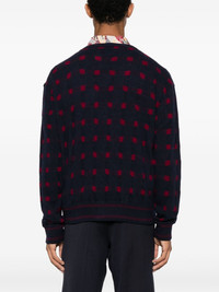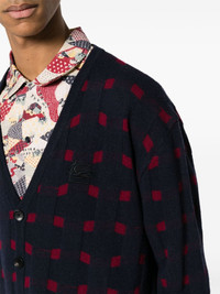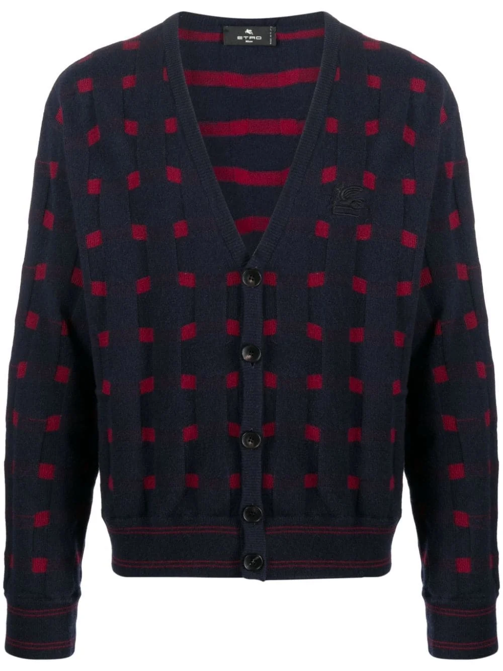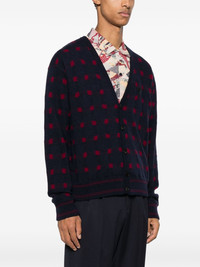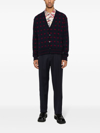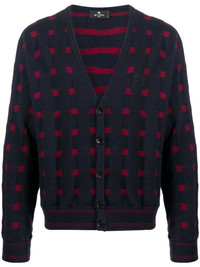 patterned-knit V-neck cardigan Highlights - Midnight blue/bordeaux red - Patterned intarsia knit - Stripe detailing - V-neck - Front button fastening - Long sleeves - Ribbed cuffs and hem Made in Italy Composition Wool 45%, Viscose 25%, Polyamide 20%, Cashmere 10% SIZE & FIT Model measurements Height 6 ft 2 in(1.87 m) Bust/Chest 38.18 in(97 cm) Hips 36.61 in(93 cm) Waist 29.13 in(74 cm) FittingInformation Designed for a relaxed fit, this piece allows for comfort and movement when worn Made with a midweight knit, this piece offers some stretch This piece fits true to size – take your usual size Washing instructions Hand Wash