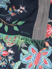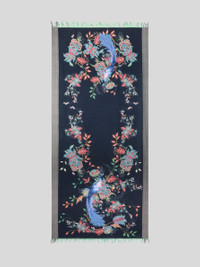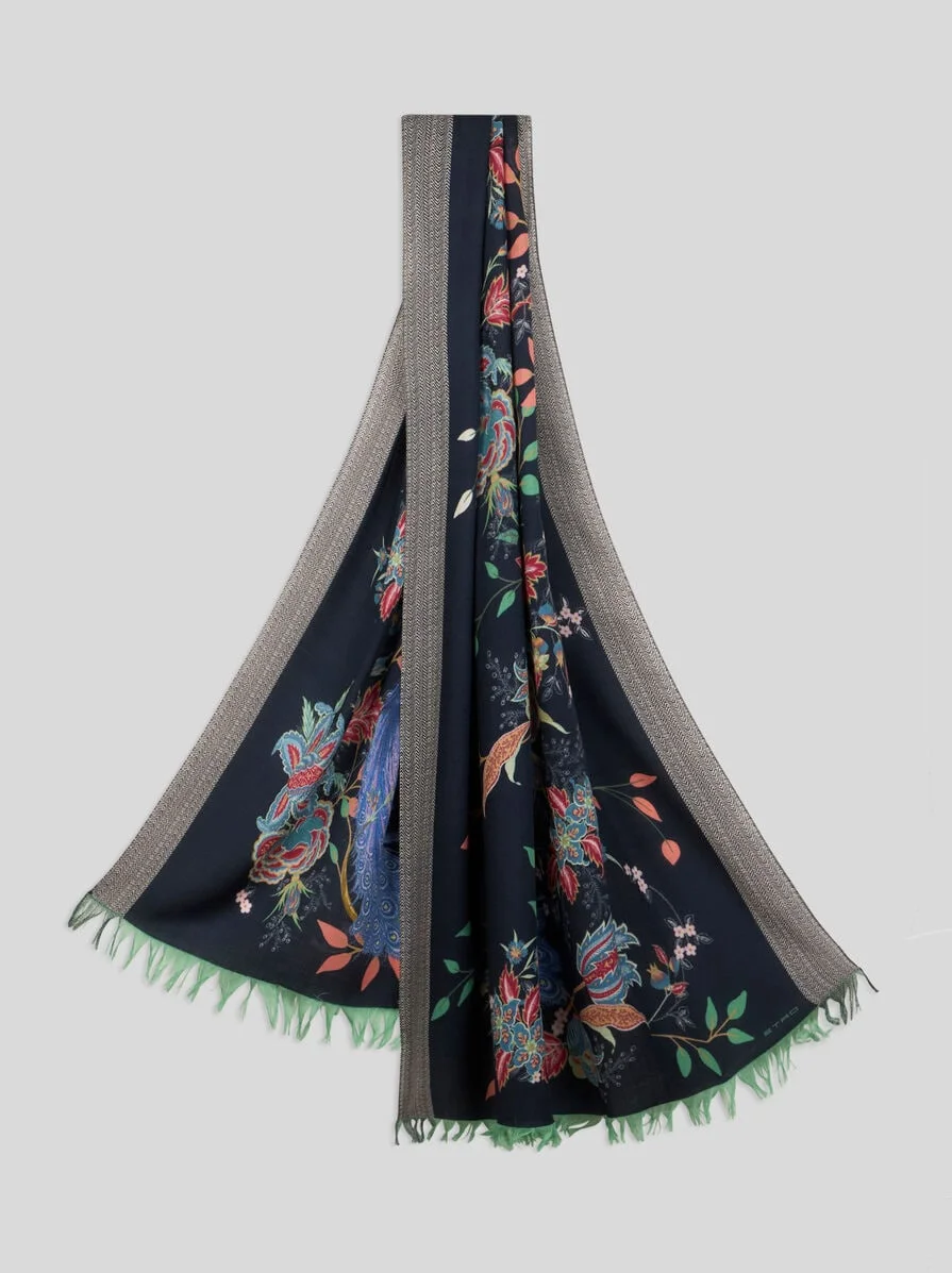 Pure wool scarf with floral motif, peacocks and contrasting edges. Completing the accessory are the slightly frayed short sides and ETRO logo in the corner. • Size: 35.4 x 78.7 inches (90 x 200 cm) • Made in Italy PRODUCT DETAILS • 100% wool