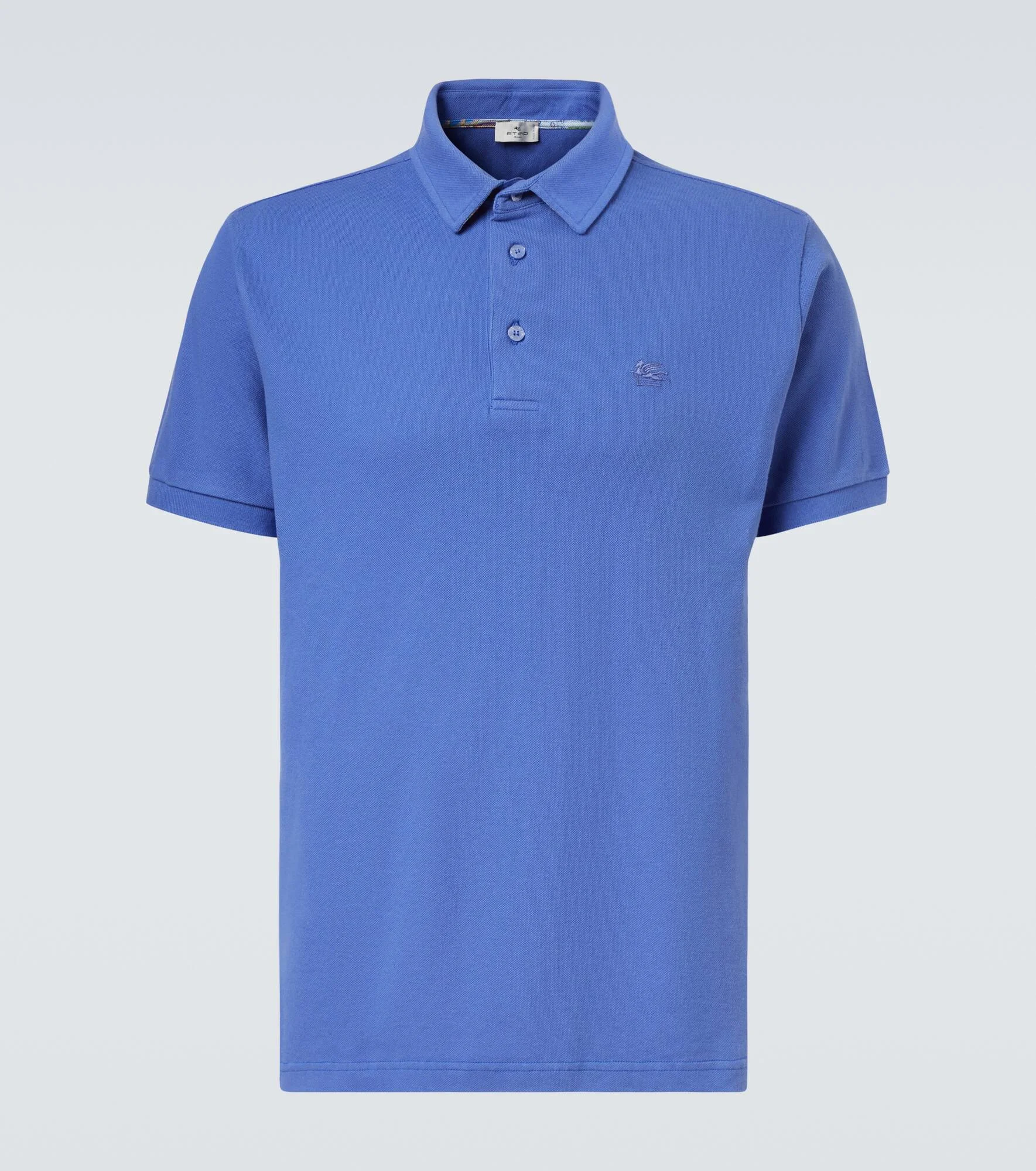 Crafted from cotton pique, this Etro polo shirt brings a timeless design with the house's signature embroidery. An emblem of the maison since 1968, the mythological Pegaso signifies a spirit of freedom and discovery. Product Details - Material: 100% cotton - Care instructions: machine wash at 30 degrees - Made in Italy - Designer color name: Blue - Item color: blue - Closure: buttoned placket - Collar: polo collar - Side slits - Cuff: ribbed - Item number: P01049744 Size & Fit - True to size - Straight fit - Slightly stretchy fabric - Falls to the hip - Height of model is 188cm-74" and wears a size L