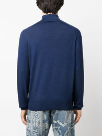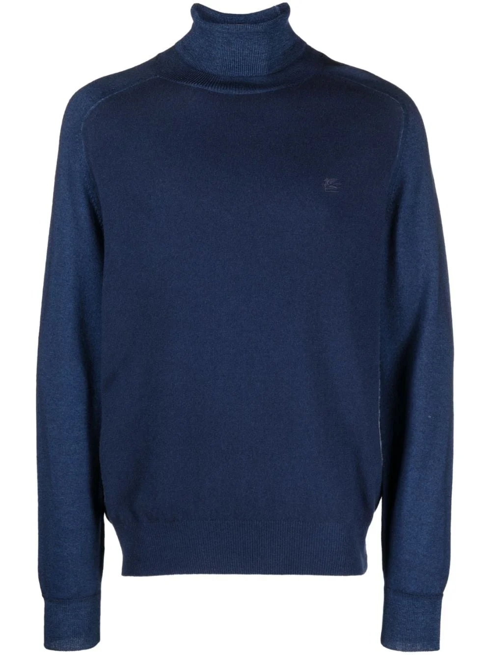 Pegaso-embroidered roll-neck jumper Highlights - Navy blue - Virgin wool - Knitted construction - Embroidered logo at the chest - Signature pegaso motif - Long sleeves - High neck - Ribbed cuffs and hem Made in Italy Composition Virgin Wool 100% SIZE & FIT Model measurements Height 6 ft 2 in(1.89 m) Bust/Chest 37.79 in(96 cm) Hips 37 in(94 cm) Waist 29.92 in(76 cm) Measurement CHEST 40.94 in(104 cm) SLEEVE LENGTH 33.07 in(84 cm) FittingInformation Designed for a regular fit, offering a comfortable loose fit throughout the body Made with a lightweight knit, this piece offers some stretch This piece fits true to size – take your usual size Washing instructions Hand Wash