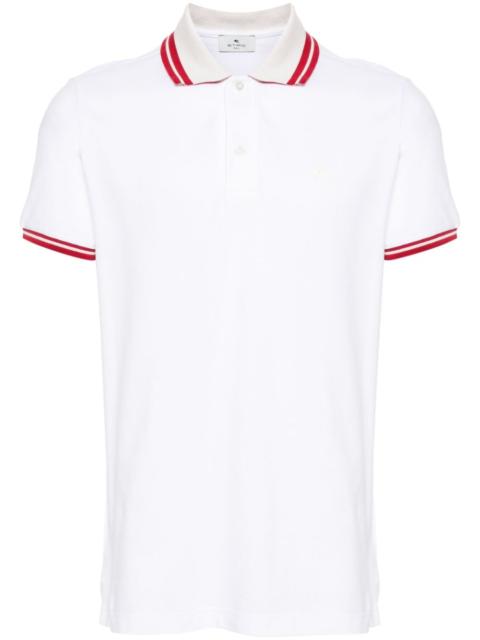 Pegaso-embroidered polo shirt ETRO's cotton polo shirt is embroidered with the signature Pegaso motif in tonal threads and is complete with contrasting striped trims. Highlights - White - Cotton - Pique weave - Embroidered logo at the chest - Signature pegaso motif - Polo collar - Striped edge - Front button placket - Short sleeves - Ribbed cuffs - Short side slits - Straight hem Made in Italy Composition Cotton 100% SIZE & FIT Model measurements Height 6 ft 2 in(1.87 m) Bust/Chest 36.41 in(92.5 cm) Hips 37 in(94 cm) Waist 29.52 in(75 cm) FittingInformation Designed for a regular fit, this polo shirt offers a comfortable loose fit throughout the body Made from a midweight non-stretch fabric, this piece offers minimal elasticity when worn This piece fits true to size – take your usual size Washing instructions Machine Wash