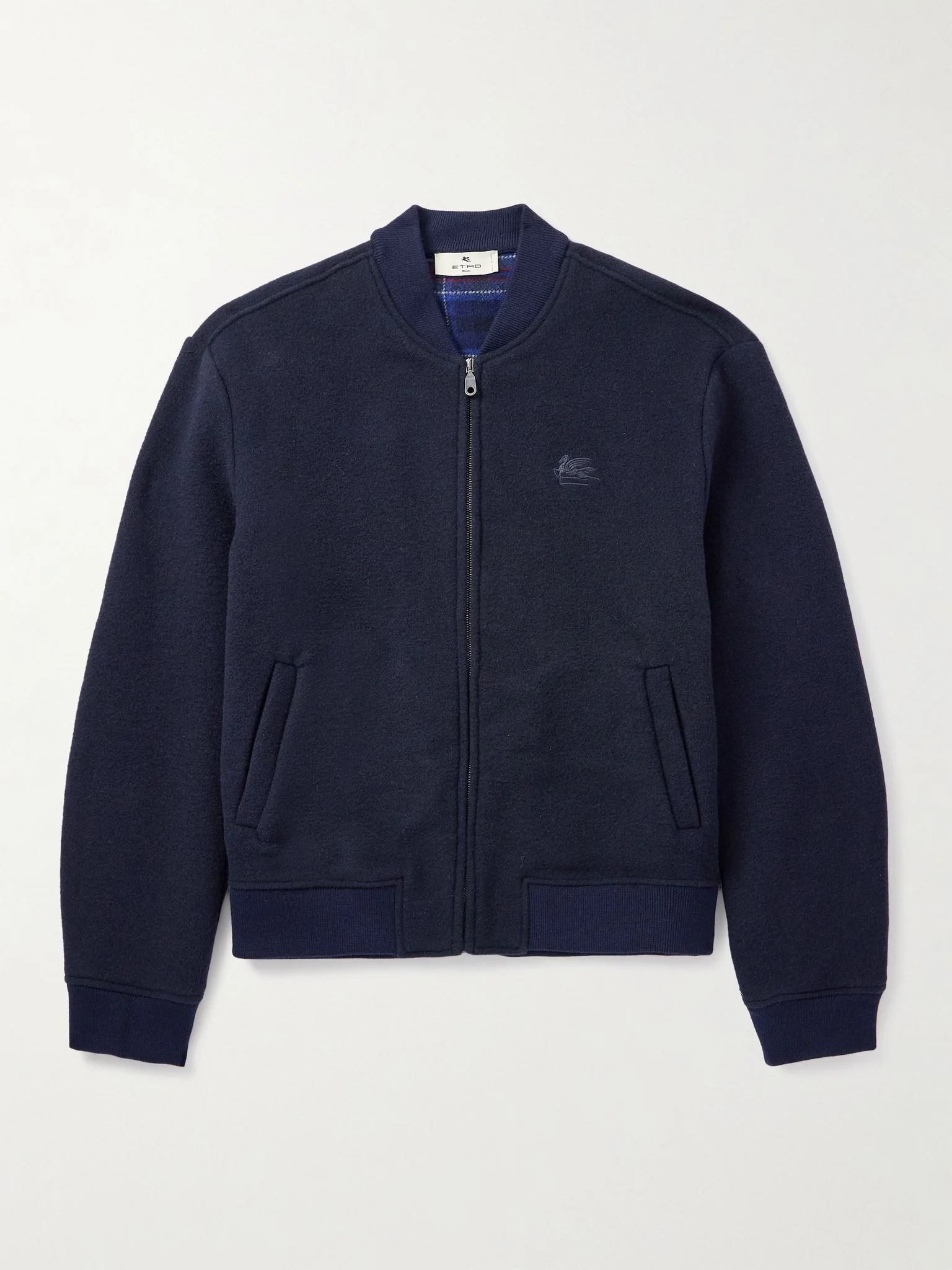 Etro puts a cosy twist on the classic bomber jacket with this wool-blend version. Made in Italy, it's embroidered with a signature 'Pegaso' logo at the chest and has a slightly loose fit for comfortable layering. Size & Fit - Fits true to size. Take your normal size - Designed for a slightly loose fit - Ribbed hem - Mid-weight, non-stretchy fabric - Model is shown wearing a M - Model measures: chest 38"/ 96cm, height 6'2"/ 188cm Details & Care - Navy wool-blend - Zip fastening - 57% wool, 32% polyester, 6% polyamide, 5% other fibres - Dry clean