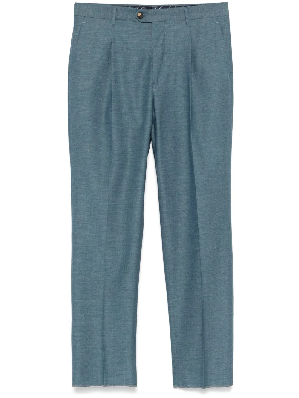 pleated tapered trousers Highlights - Cerulean blue - Concealed front button, hook and zip fastening - Belt loops - Two side slash pockets - Two rear jetted pockets Made in Italy Composition Wool 65%, Viscose 35% SIZE & FIT Model measurements Height 6 ft 2 in(1.87 m) Bust/Chest 36.41 in(92.5 cm) Hips 37 in(94 cm) Waist 29.52 in(75 cm) FittingInformation Designed for a tapered leg, offering a loose unrestricted fit over the leg with a closer fit towards the ankle Made from a midweight non-stretch fabric
