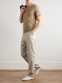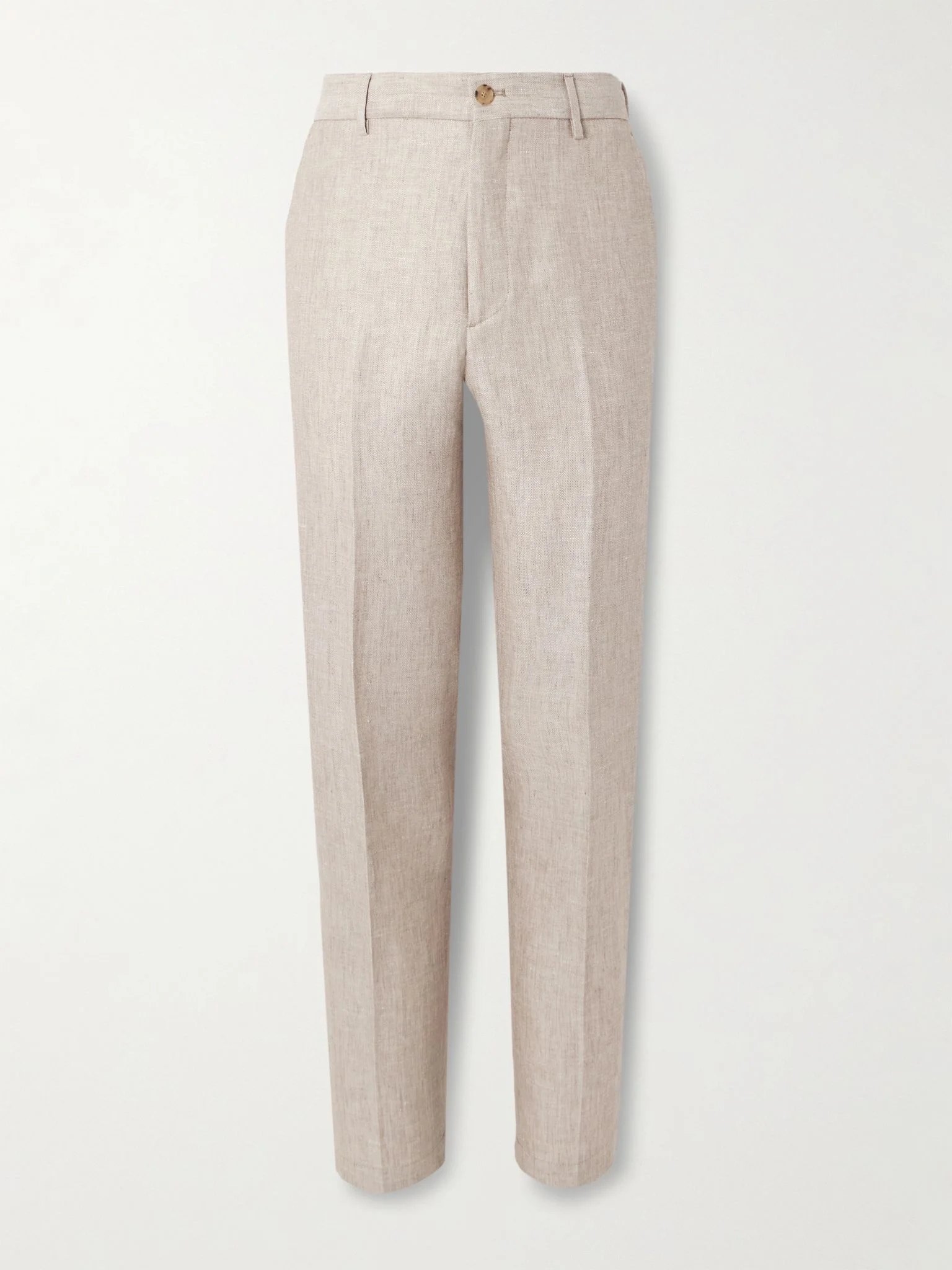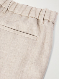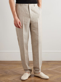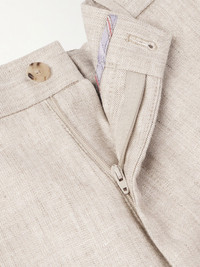 From Etro's cruise capsule, these trousers are tailored from a linen and wool-blend, so they're breathable and drape well. Made in Italy, they're cut in a tapered, flat-front profile and have a partially elasticated waistband, which makes them a good choice for travelling. Wear yours with loafers or leather sandals. Size & Fit - Fits true to size. Take your normal size - Tapered leg, mid-rise style - Lightweight, non-stretchy fabric - Model is shown wearing an IT 48 - Model measures: waist size 32, height 6'2"/ 188cm Details & Care - Beige linen and wool-blend - Button and zip fastening - 60% linen, 40% wool - Dry clean