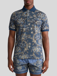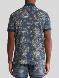 Pure cotton polo shirt with decorative maxi flowers – some of which feature the brand lettering – all over. Plain-coloured collar and sleeve edging. Completing the garment are the tone-on-tone embroidered Pegaso symbol and ETRO monogram on the chest. • Roma fit • Made in Italy • The model is 6' 1½" (187 cm) tall and wears a size M PRODUCT DETAILS • 100% cotton