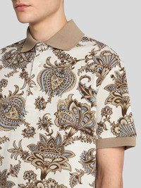 Pure cotton polo shirt with decorative maxi flowers – some of which feature the brand lettering – all over. Plain-coloured collar and sleeve edging. Completing the garment are the tone-on-tone embroidered Pegaso symbol and ETRO monogram on the chest. • Roma fit • Made in Italy • The model is 6' 1½" (187 cm) tall and wears a size M PRODUCT DETAILS • 100% cotton
