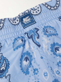 Etro's swim shorts are printed with variations of its signature paisley motif, originally inspired by antique shawls. Made in Italy, they're cut from lightweight, quick-drying shell and appliqued with a logo at the back of the elasticated waistband. Size & Fit - Fits true to size. Take your normal size - Relaxed-straight leg, mid-rise style - Mid-length - Built-in briefs - Elasticated at the waist - Model is shown wearing a M - Model measures: waist size 32, height 6'1"/ 185cm Details & Care - Tonal-blue shell - 100% polyester - Hand wash