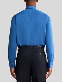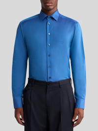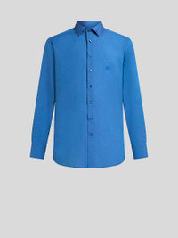 Solid-colour pure cotton shirt with a distinctive glossy finish. The tonal embroidered ETRO monogram and iconic Pegaso symbol stand out on the chest. • Roma regular fit • Tonal branded-button closure • Double-buttoned working cuffs • Made in Italy • The model is 6' 1½" (187 cm) tall and wears a size 39 PRODUCT DETAILS • 100% cotton