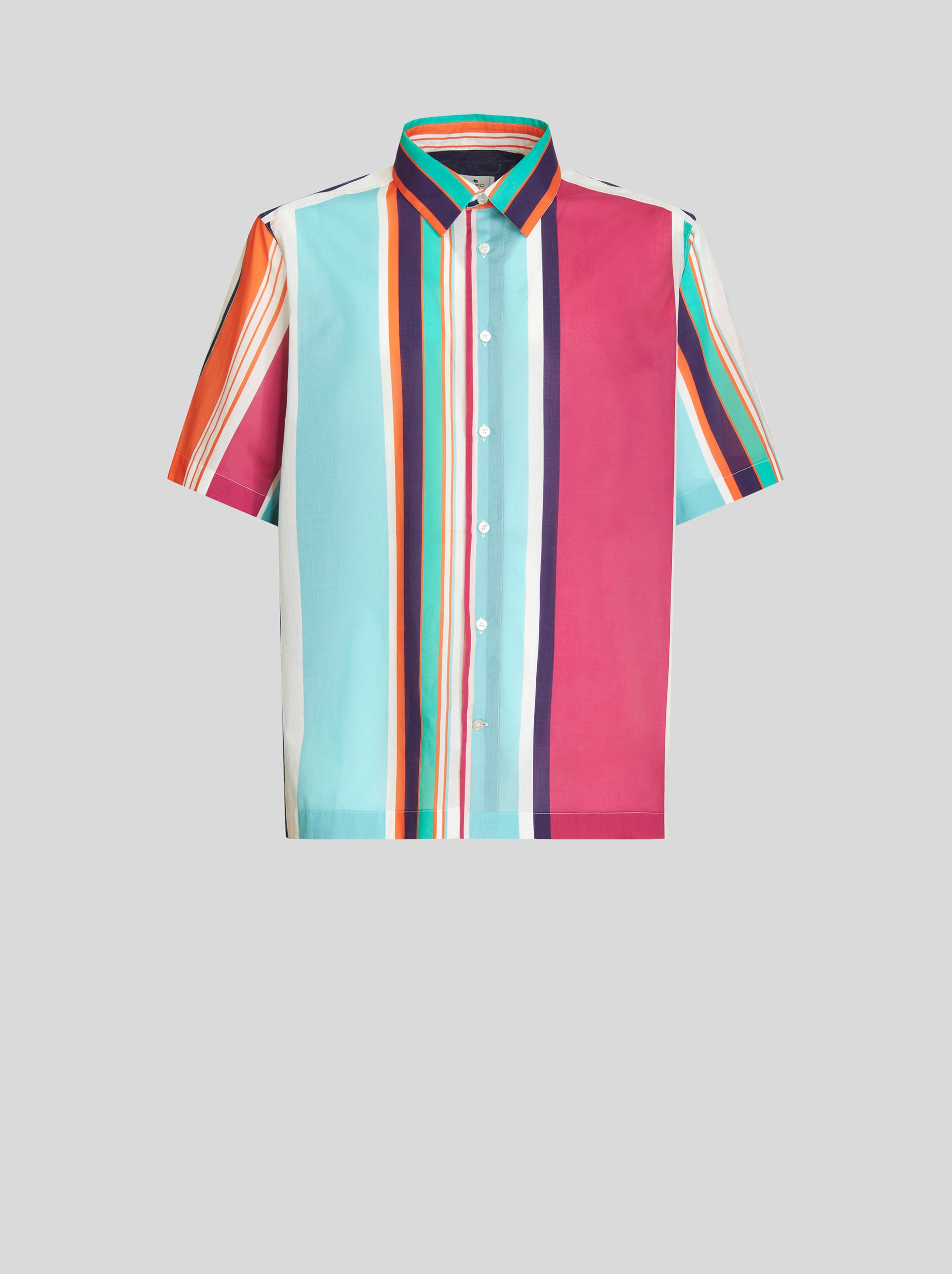 Short-sleeved cotton shirt embellished by multi-coloured vertical stripes. PRODUCT DETAILS • 100% cotton • Comfort fit • Pointed collar • Short sleeves • Made in Italy • The model is 187 cm tall and wears size M