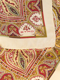 Pure silk twill jacquard pocket square with distinctive abstract Paisley motif and geometric-patterned edges. This accessory is complete with an ETRO logo in the corner. • Size: 16.9 x 16.9 inches (43 x 43 cm) • Made in Italy PRODUCT DETAILS • 100% silk