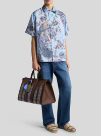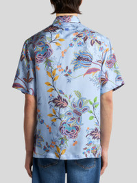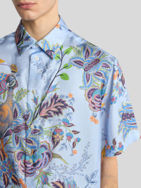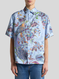 Short-sleeved pure silk shirt. This model features a placed print depicting a peacock and floral patterns. • Loose fit • Pointed collar • Short sleeves • Made in Italy • The model is 6' 1½" (187 cm) tall and wears a size 39 PRODUCT DETAILS • 100% silk