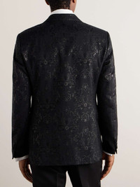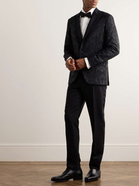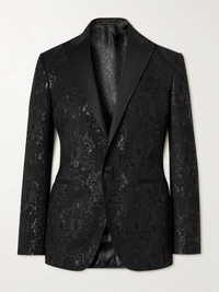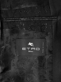 Made in Italy, Etro's wool-blend tuxedo jacket is patterned with the house's signature paisley and flecked with metallic threads. It's otherwise quite classically tailored, with silk-trimmed peak lapels, jetted pockets and covered buttons. Size & Fit - Fits true to size. Take your normal size - Tailored for a regular fit - Mid-weight, non-stretchy fabric - Model is shown wearing an IT 48 - Model measures: chest 38"/ 96cm, height 6'2"/ 188cm Details & Care - Black metallic wool-blend - Peak lapels, non-functioning buttoned cuffs, chest welt pocket, two front welt pockets, double vent, three internal slip pockets, fully lined - One button fastening - 84% wool, 11% cotton, 3% metallic fiber, 2% elastane; trim: 78% silk, 22% polyester; lining: 100% viscose - Dry clean