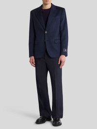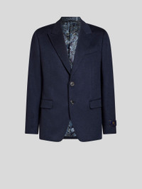 Single-breasted, plain-coloured pure cashmere jacket. This garment features a contrasting floral Paisley motif on the undercollar and lining and is complete with a tailor's label featuring the Pegaso symbol and ETRO logo on the sleeve. • Regular fit • Peak lapels • Single-breasted two-button closure • Front pockets with flap • Made in Italy • The model is 6' 1" (186 cm) tall and wears a size 48 PRODUCT DETAILS • 100% cashmere • Bodice lining: 100% viscose • Sleeve lining: 52% viscose, 48% acetate