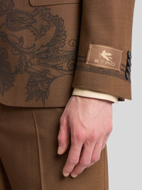Single-breasted pure wool jacket with placed floral motif. This model is finished with a contrasting undercollar and a tailor's label featuring the Pegaso symbol and ETRO logo on the sleeve. • Regular fit • Peak lapels • Single-breasted two-button closure • Front pockets with flap • Made in Italy • The model is 6' 1" (186 cm) tall and wears a size 48 PRODUCT DETAILS • 100% wool • Lining: 52% viscose, 48% acetate