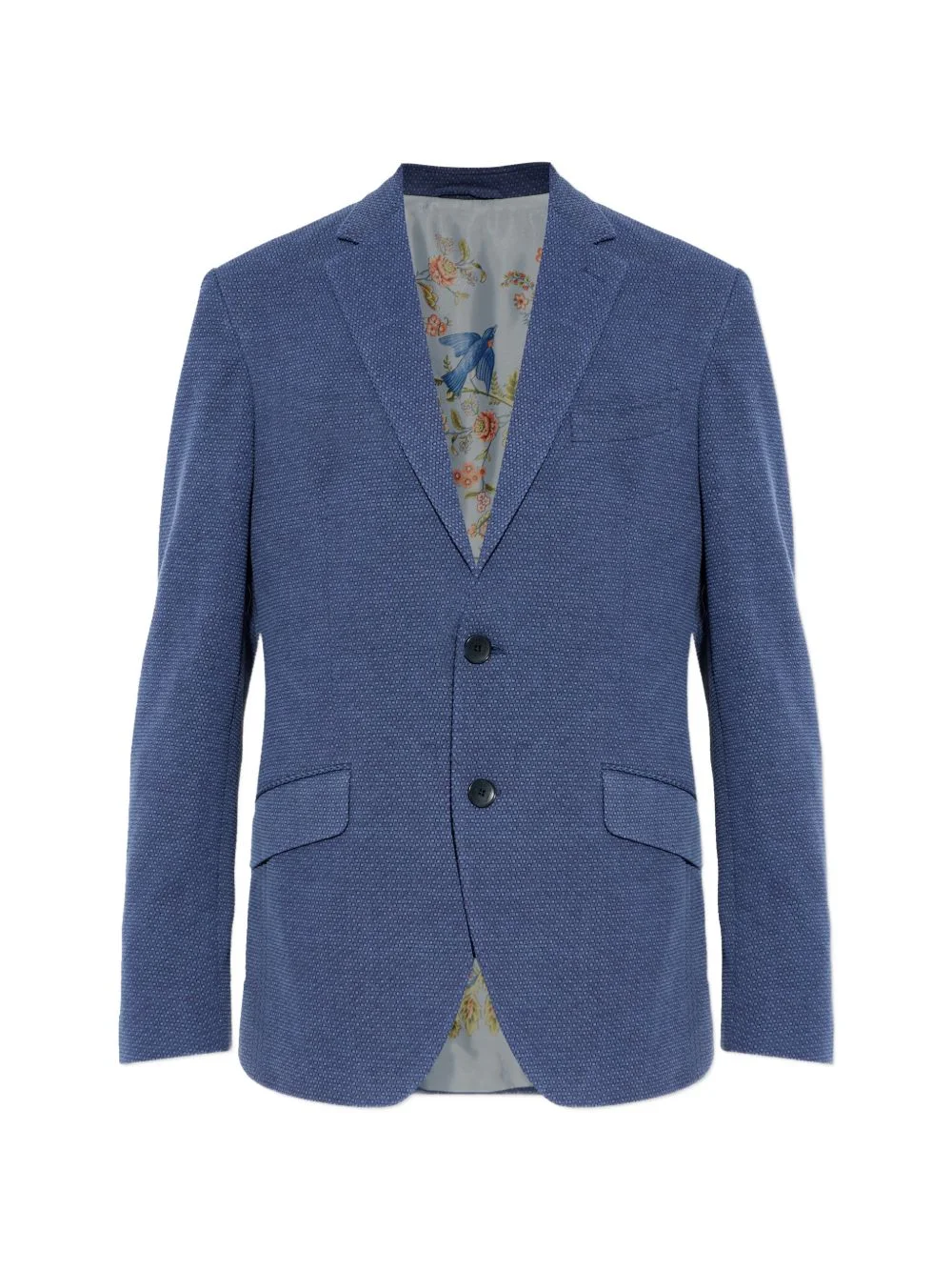 single-breasted textured blazer Highlights - Blue - Button fastening - Flap pockets - Textured finish - Long sleeves - Buttoned cuffs - Notched lapels Made in Italy Composition Outer: Cotton 82%, Polyester 16%, Elastane 2% Washing instructions Read Manufacturer Guidelines