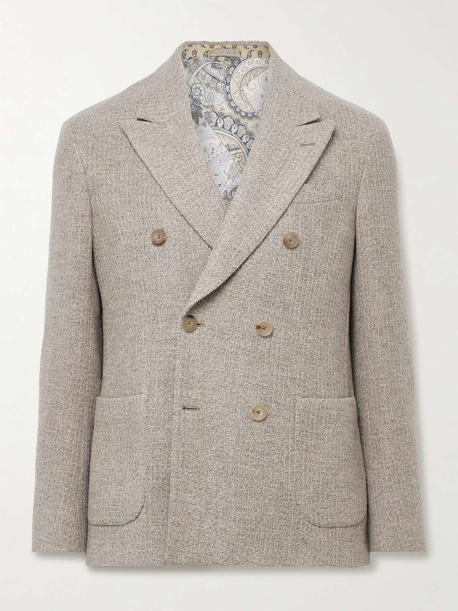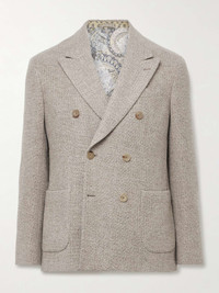Etro's blazer has been tailored in Italy from a wool and cashmere-blend with plenty of texture. Designed in a double-breasted profile, it has sharp peak lapels and padded shoulders for structure. The smooth satin lining is printed with the brand's signature paisley swirls. Size & Fit - Fits true to size. Take your normal size - Tailored for a slim fit - Mid-weight, non-stretchy fabric - Model is shown wearing an IT 48 - Model measures: chest 38"/ 96cm, height 6'2"/ 188cm Details & Care - Beige mélange textured-wool and cashmere-blend - Peak lapels, felted undercollar, non-functioning buttoned cuffs, chest welt pocket, two front patch pockets, double vent, internal slip pockets, fully lined - Double-breasted button fastenings - 97% wool, 3% cashmere; buttons: 100% horn (Buffalo); lining1: 100% viscose; lining2: 52% viscose, 48% acetate - Dry clean