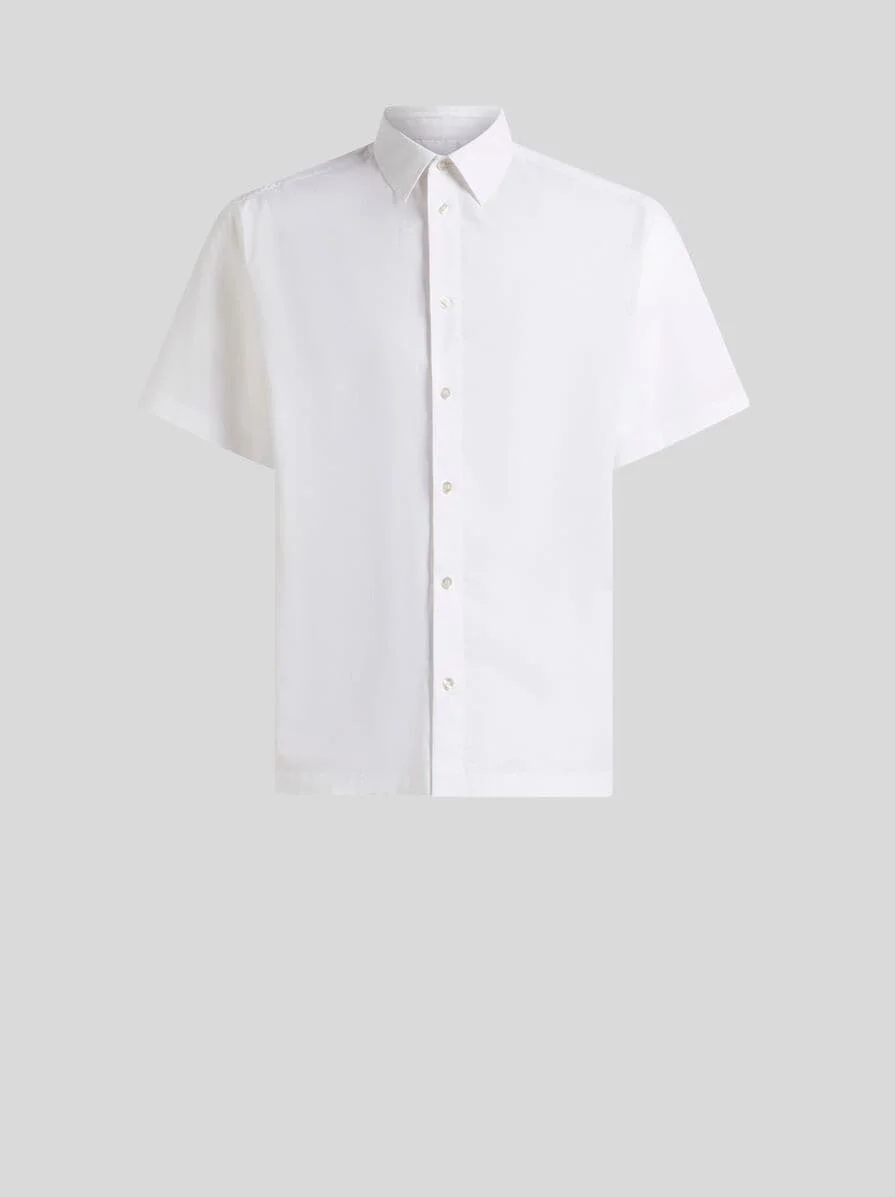 Slightly cropped, short-sleeved shirt in stretch cotton fabric embellished with a maxi print featuring an octopus and ETRO logo on the back. • Easy fit • Pointed collar • Short sleeves • Made in Italy • The model is 6' 1½" (187 cm) tall and wears a size M PRODUCT DETAILS • 97% cotton, 3% elastane