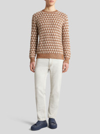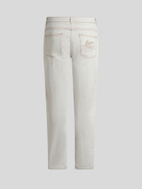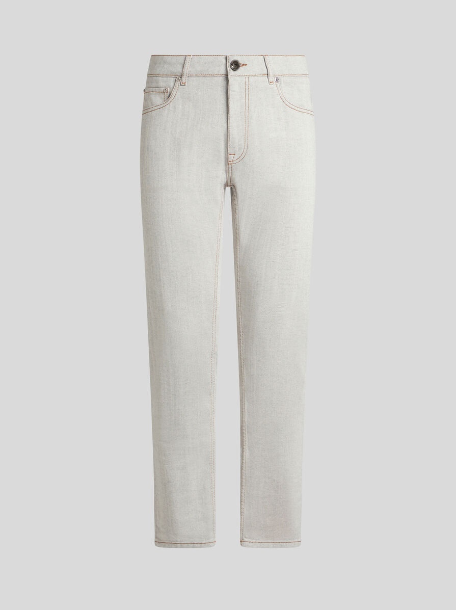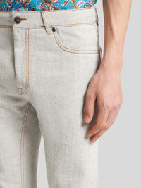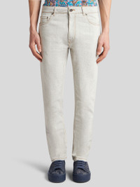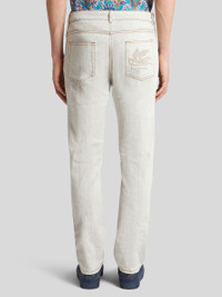 Regular-fit cotton denim jeans embellished with a leather label featuring the Pegaso symbol and ETRO logo. PRODUCT DETAILS • 98% cotton, 2% elastane • Regular fit • Covered button and zip closure • Rear leather label with ETRO logo and Pegaso • Made in Italy • The model is 74.01" (188 cm) inches tall and wears a size 32 (IT)