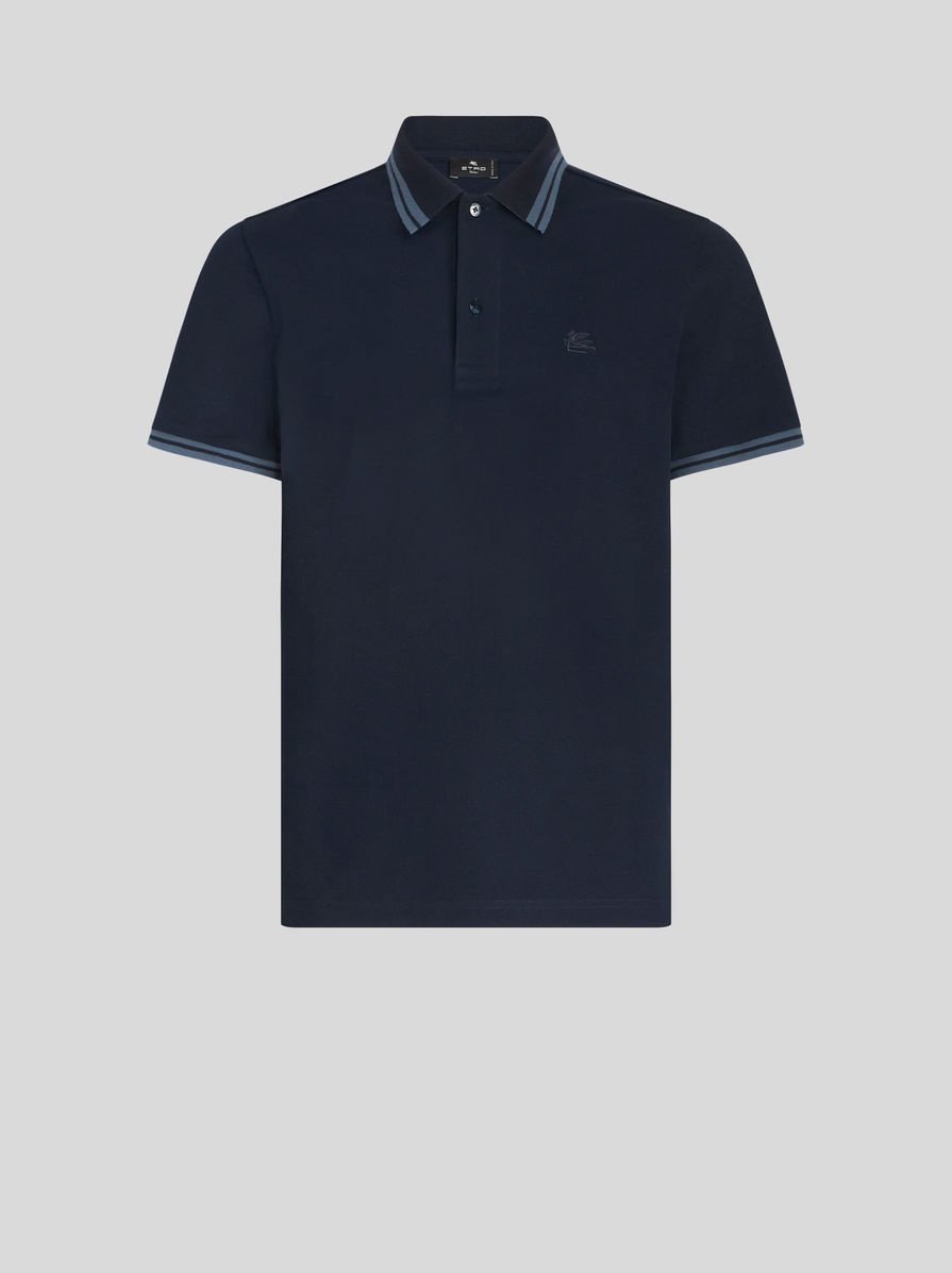 Cotton pique polo shirt embellished with a tone-on-tone embroidered Pegaso symbol and ETRO logo on the chest. The collar and sleeves are decorated with a striped pattern. PRODUCT DETAILS • 100% cotton • Regular fit • Made in Italy • The model is 188 cm / 74.01 tall and wears a size M