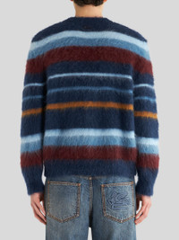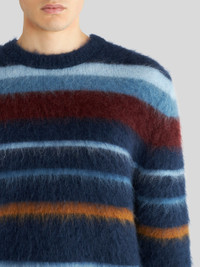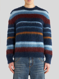 Round neck mohair wool jumper featuring horizontal stripes. PRODUCT DETAILS • 67% mohair, 28% nylon, 5% wool • Regular fit • Round neck • Ribbed borders • Made in Italy • The model is 188 cm/74 inches tall and wears size M