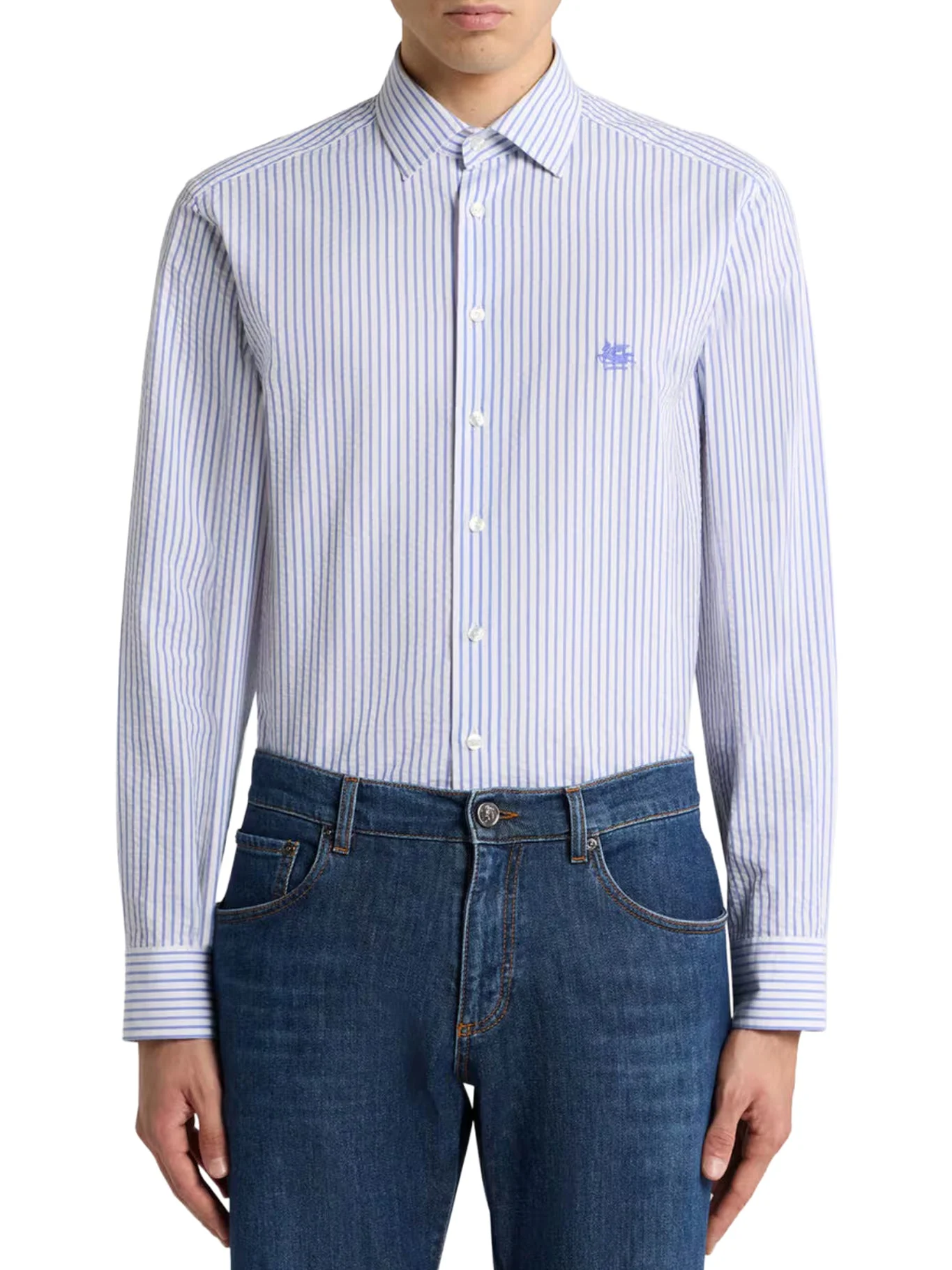 - Pointed collar - Button closure - Double-button cuffs - Seersucker cotton - Striped pattern - Small embroidered Pegasus logo on the chest - Regular fit - The model is 186 cm tall and wears a size 39 - Color: White/Blue Made in Italy Composition: Cotton 100% cotton Color code: S8460 BICOLOR MRIB000299TR5A9S8460