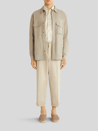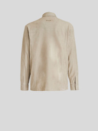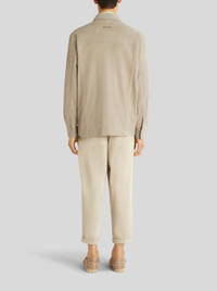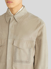 Suede safari jacket featuring geometric Paisley bandana intarsia embroidery on front pocket and embellished by four micro Crown Me ETRO studs on rear representing the letters ETRO. PRODUCT DETAILS • Exterior: 100% calfskin • Body lining: 100% cupra • Sleeve lining: 100% viscose • Regular fit • Shirt collar • Press button fastening • Patch breast pockets • Side pockets with buttons • Piped inside pockets • Wrists with press button • Straight bottom • Made in Italy • The model is 188 cm tall and wears size M