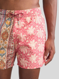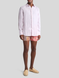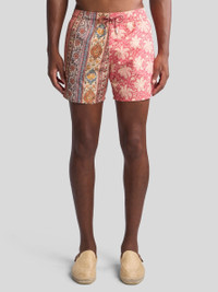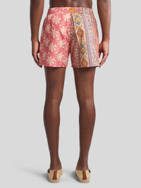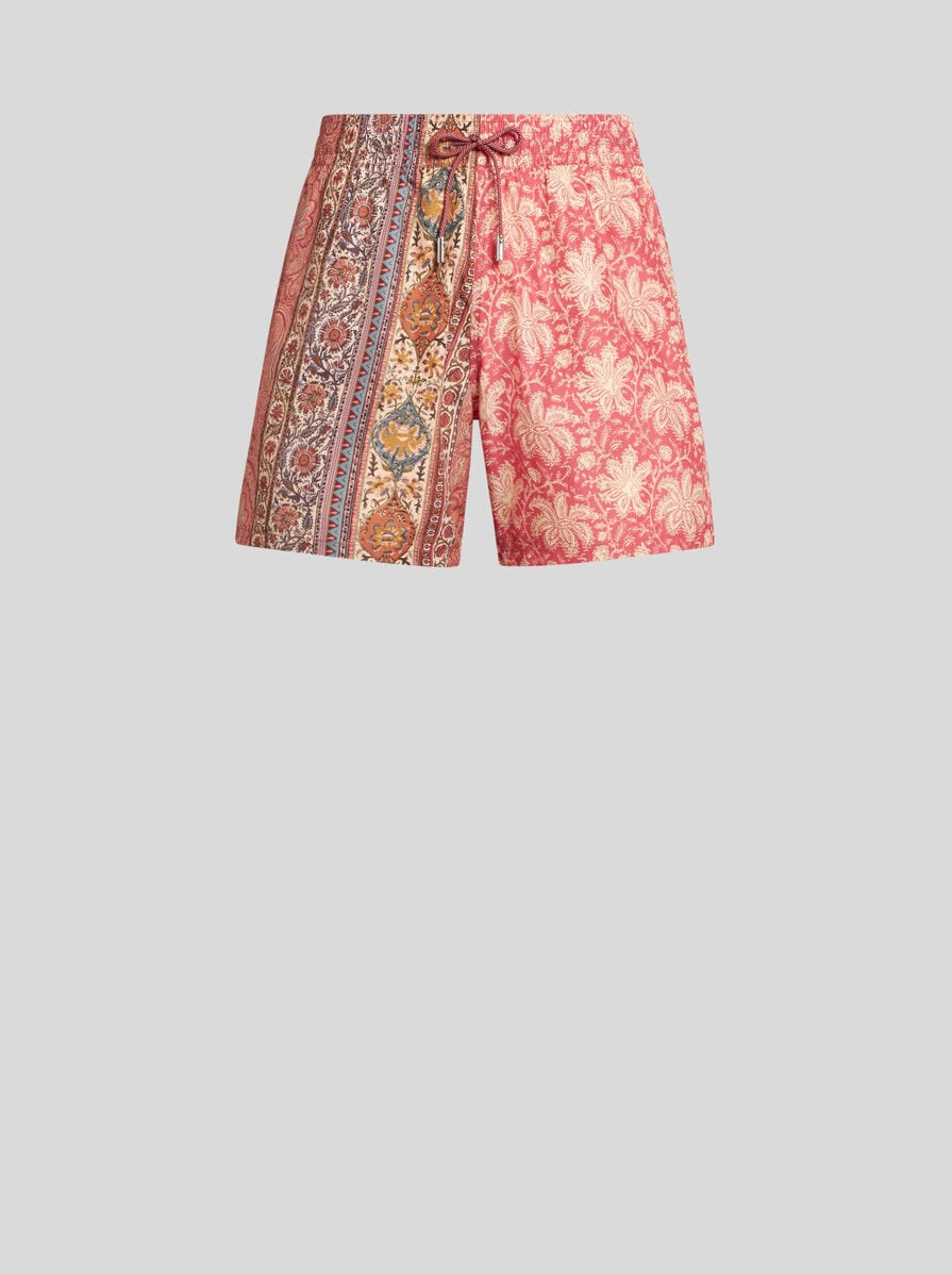 Technical fabric swim shorts with all-over double print. This model is embellished with a patch bearing the Pegaso symbol and the ETRO monogram embroidered on the back. • Roma regular fit • Elasticated waist • Side slip pockets • Drawstring with logo-branded tips • Made in Italy • The model is 6' 1½" (187 cm) tall and wears a size M PRODUCT DETAILS • 100% polyester