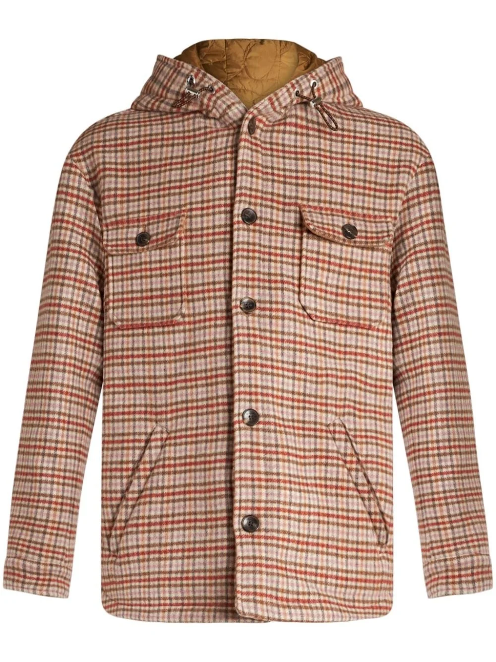 tartan-check hooded shirt jacket Highlights - Light pink - Wool-cashmere blend - Tartan check pattern - Drawstring hood - Long sleeves - Front button fastening - Two diagonal pockets to the sides - Two chest flap pockets - Straight hem Imported Composition Outer: Wool 80%, Cashmere 20% Lining: Polyamide 100%, Polyester 100%