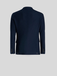 Worked weave cotton jersey jacket embellished by a printed Paisley pattern lining. • Regular fit • Single-breasted fastening • Piped breast pocket • Front pockets with flap • Piped inside pockets • Rear slits • Made in Italy PRODUCT DETAILS • Exterior: 100% cotton • Body lining: 50% viscose, 50% cupra • Sleeve lining: 57% viscose, 43% polyester