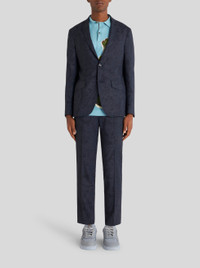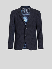 Virgin wool jacket featuring a ton-sur-ton ornamental Paisley print and embellished by an all-over floral Paisley lining. PRODUCT DETAILS • Exterior: 99% virgin wool, 1% elastane • Body: 50% viscose, 50% cupra • Sleeves: 100% viscose • Regular fit • Single-breasted fastening • Piped breast pocket • Front pockets with flap • Piped inside pockets • Galalith buttons • Rear slits • Made in Italy • The model is 188 cm tall and wears size 48 Sku: 231U1180740140200