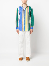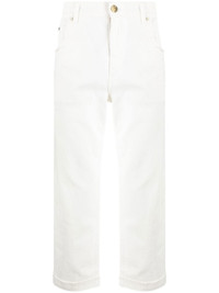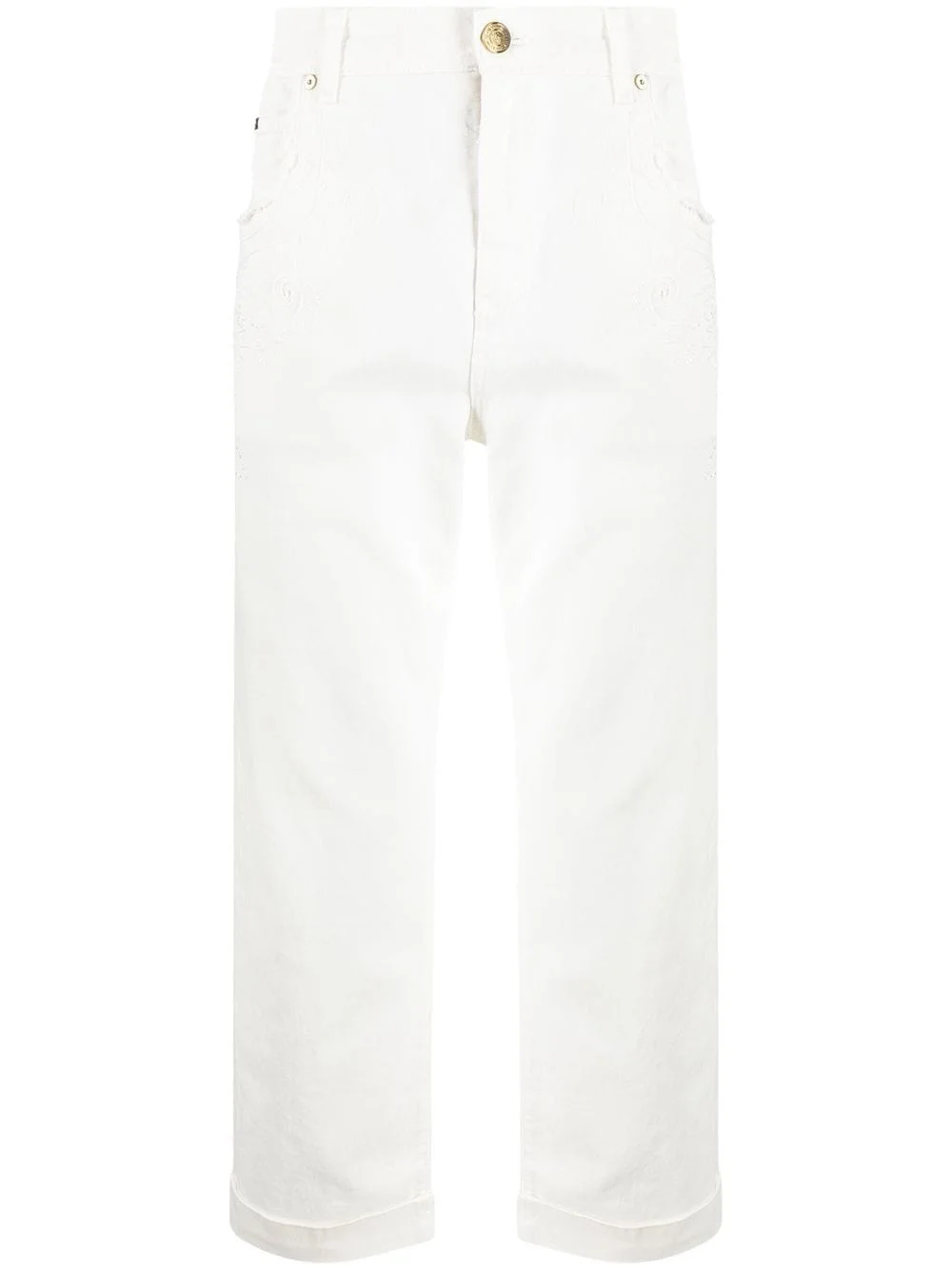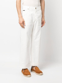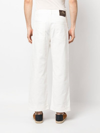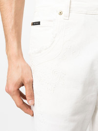 tonal-embroidered cotton trousers white cotton blend tonal design embroidered design belt loops button fastening zip fly fastening classic five pockets logo patch to the rear wide leg turn-up cuffs Made in Italy Composition Cotton 97%, Elastane 3% SIZE & FIT Model measurements Height 6 ft 1 in(1.86 m) Bust/Chest 37.4 in(95 cm) Hips 36.22 in(92 cm) Waist 29.52 in(75 cm) FittingInformation This piece fits true to size. We recommend you get your regular size Designed for a slim fit at the waist and loose over the leg Made with a mid-weight fabric Washing instructions Machine Wash