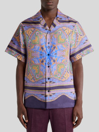 Pure silk twill shirt with placed, geometric Paisley print and leafy motifs. • Easy fit • Bowling collar • Short sleeves • Made in Italy • The model is 6' 1½" (187 cm) tall and wears a size 39 PRODUCT DETAILS • 100% silk