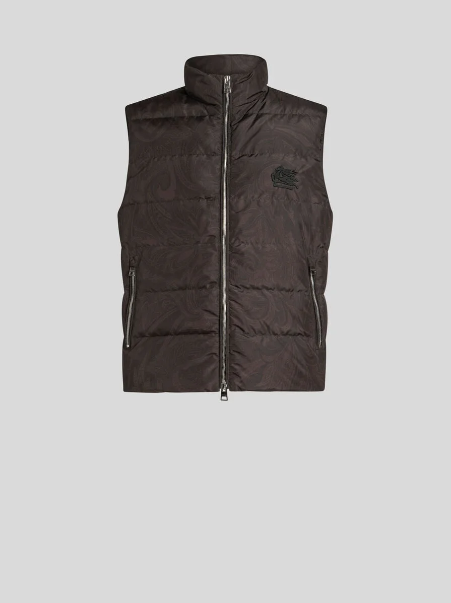 Nylon and cotton-blend quilted waistcoat, with decorative Paisley print on the front. This model is embellished with an embroidered Pegaso symbol and ETRO logo on the chest. • Regular fit • Turtleneck • Two-way zip closure • Side slip pockets with zip • Made in Hungary • The model is 6’1”(186 cm) tall and wears a size M PRODUCT DETAILS • Patterned fabric: 100% polyester • Back/Sleeves: 65% polyester, 31% cotton, 4% elastane • Padding: 100% polyester