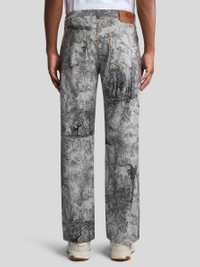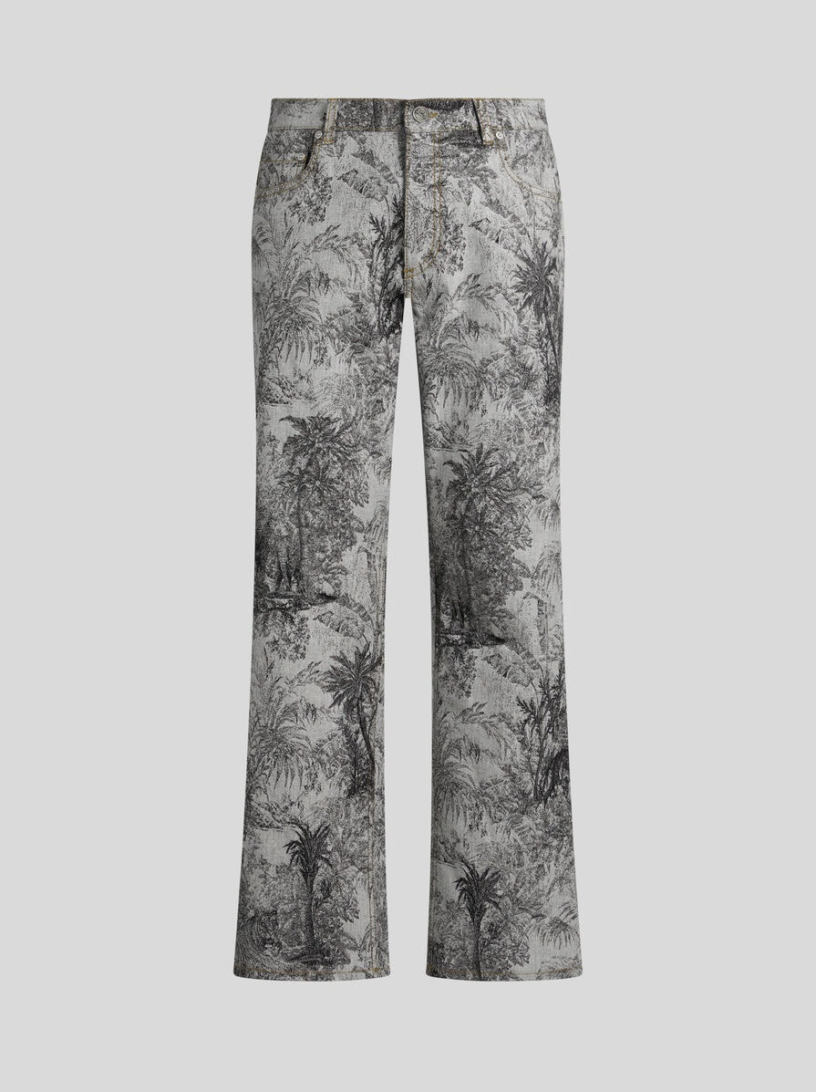 Five-pocket jeans with a wide, straight leg. The stretch cotton denim model features an all-over jacquard design and a metal button with a raised Pegaso logo. The tag with Pegaso symbol and ETRO logo complete the piece. • Loose fit • High waist • Concealed zip and Pegaso button closure • Rear leather label with ETRO logo and Pegaso • Made in Italy • The model is 6' 1½" (187 cm) tall and wears a size 32 PRODUCT DETAILS • 98% cotton, 2% elastane