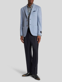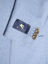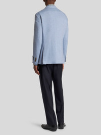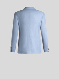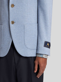 Wool and cashmere-blend jersey knit blazer, embellished with a tailored label, hand-stitched onto the cuff. This model features a paisley-stamped undercollar and lining. • Regular fit • Classic lapels • Single-breasted closure with horn buttons • Welt breast pocket • Side slip pockets • On the cuffs, the first button features the hand-embroidered “E” logo in contrasting thread • Matching AMF stitching on seam allowances • Rear vents • Made in Italy • The model is 6’2” (188 cm) tall and wears a size 48 (IT) PRODUCT DETAILS • 40% wool, 33% cashmere, 27% polyamide • Lining: 100% viscose • Sleeves: 57% viscose, 43% polyester