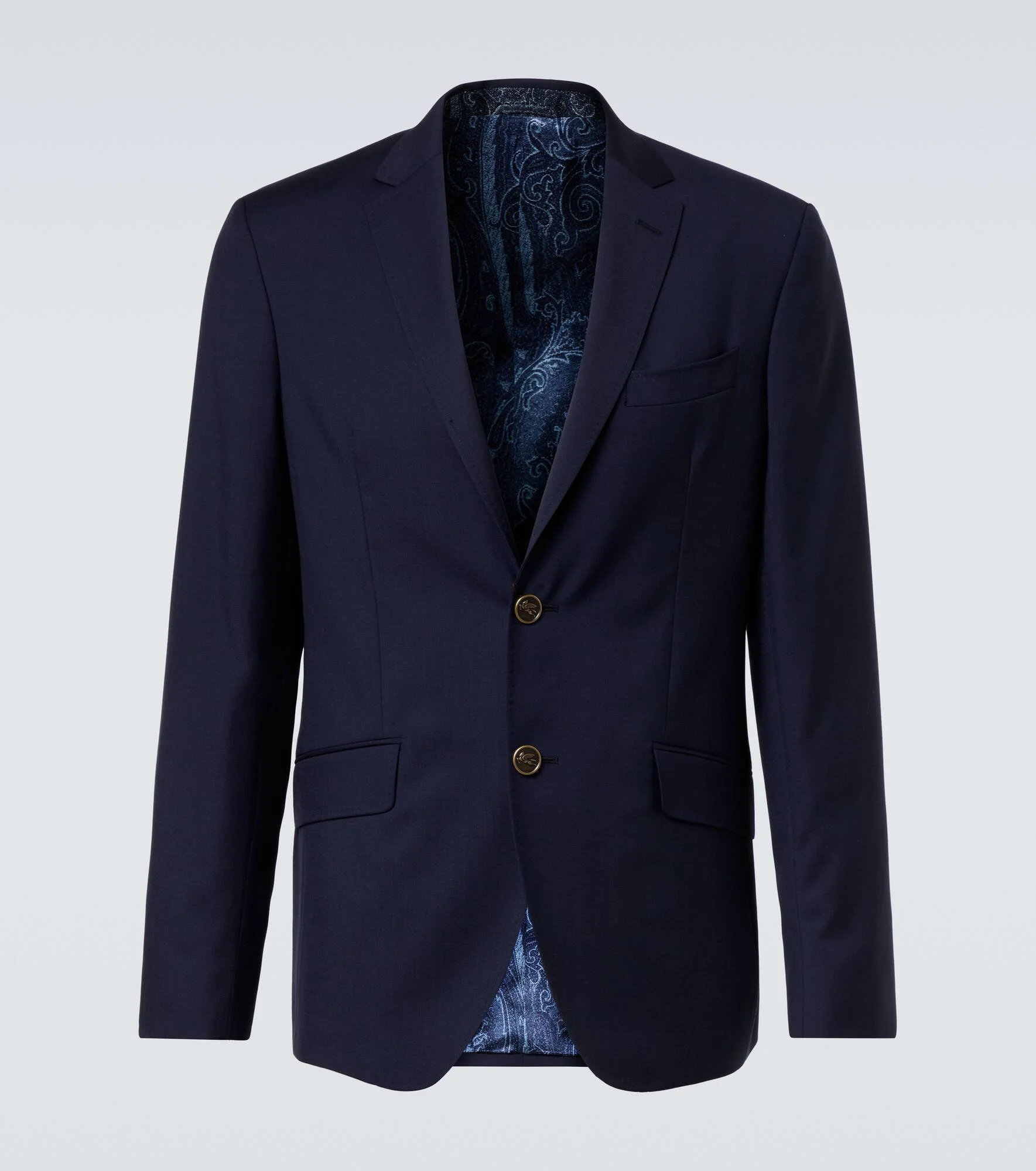 Paisley prints are so synonymous with Etro that they've become a house signature. The pattern appears on the inner lining of this single-breasted, Italian-made wool blazer. Product Details - Material: 100% wool - Care instructions: dry clean - Made in Italy - Color: blue - Designer color name: Dark Blue - Lining: 100% viscose - Sleeve lining: 52% viscose, 48% acetate - Cuff: four buttons - Pockets: flap pockets, internal pockets - Closure: single-breasted (two buttons) - Side slits - Item number: P01135070 Size & Fit - True to size - Regular fit - Non-stretchy fabric - Falls below the hip - Height of model is 189cm-74.5" and wears a size IT 50