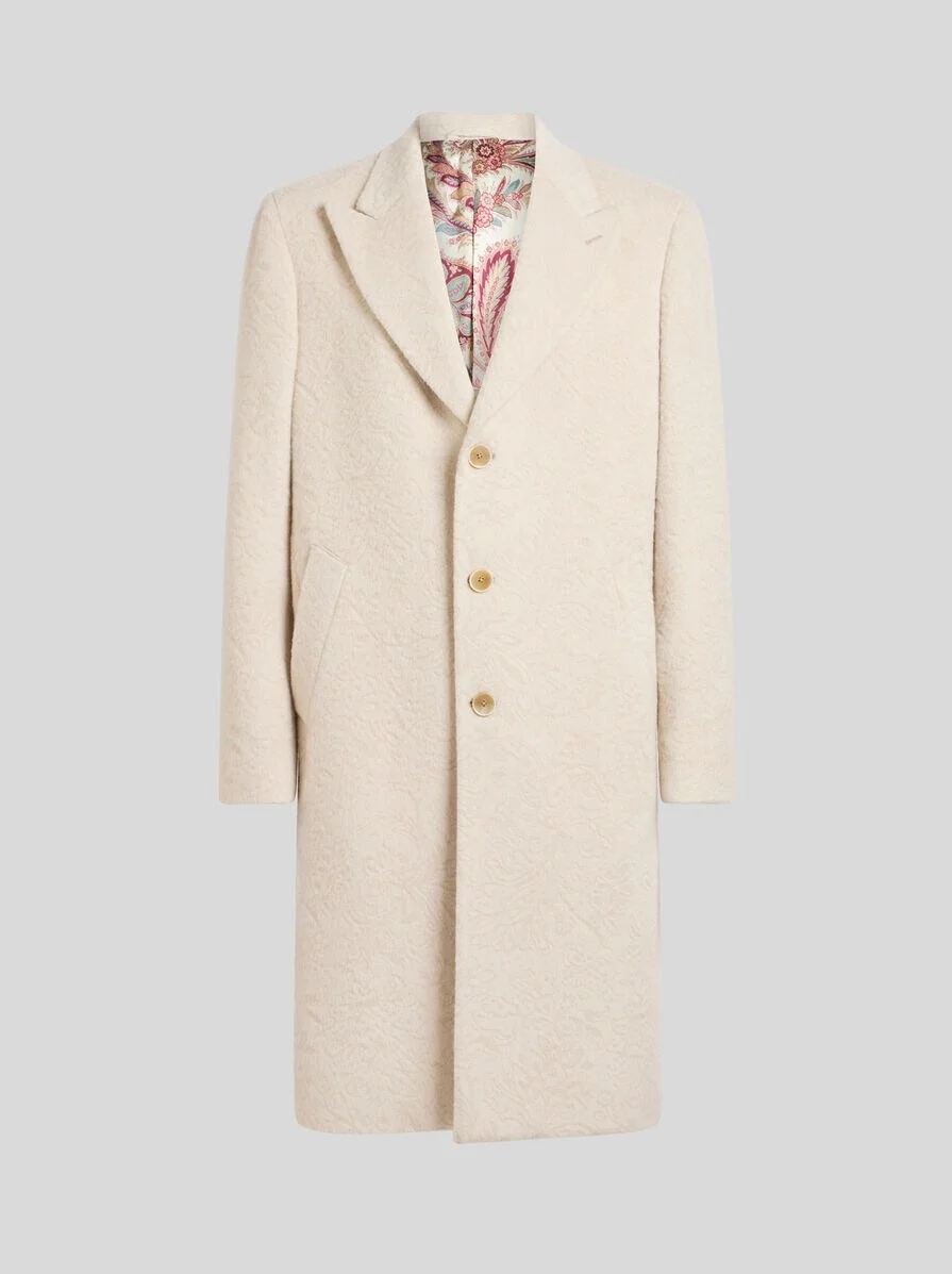 Single-breasted coat in wool- and mohair-blend fabric with floral jacquard motif. The contrasting printed lining completes the model. • Easy fit • Peak lapels • Single-breasted three-button closure • Side slip pockets • Made in Italy • The model is 6' 1½" (187 cm) tall and wears a size 48 PRODUCT DETAILS • 63% wool, 19% polyamide, 18% mohair • Bodice lining: 100% viscose • Sleeve lining: 52% viscose, 48% acetate