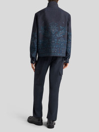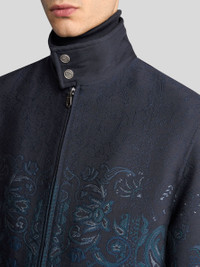 Wool-blend jacket with floral tapestry-inspired jacquard motif, comprising a tone-on-tone upper part and contrasting lower part. This model features a stand-up collar with two metal Pegaso buttons. • Regular fit • Stand-up collar with Pegaso buttons • Zip closure • Side slip pockets • Made in Italy • The model is 6' 1½" (187 cm) tall and wears a size M PRODUCT DETAILS • 38% wool, 37% polyester, 25% cotton • Lining: 52% viscose, 48% acetate