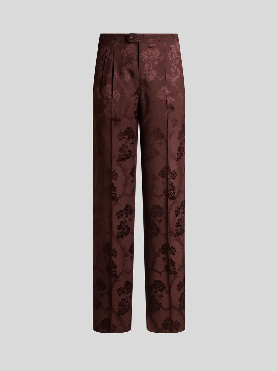 Tailored wool-blend trousers with floral jacquard motif. Complete with front pleats, this item was presented at the Autumn-Winter 25 Runway Show. • Regular fit • Side slip pockets • Rear button-through welt pockets • Concealed zip and button closure • Pleats • Made in Italy • The model is 6' 1" (186 cm) tall and wears a size 48 PRODUCT DETAILS • 84% viscose, 16% wool • Lining: 100% viscose