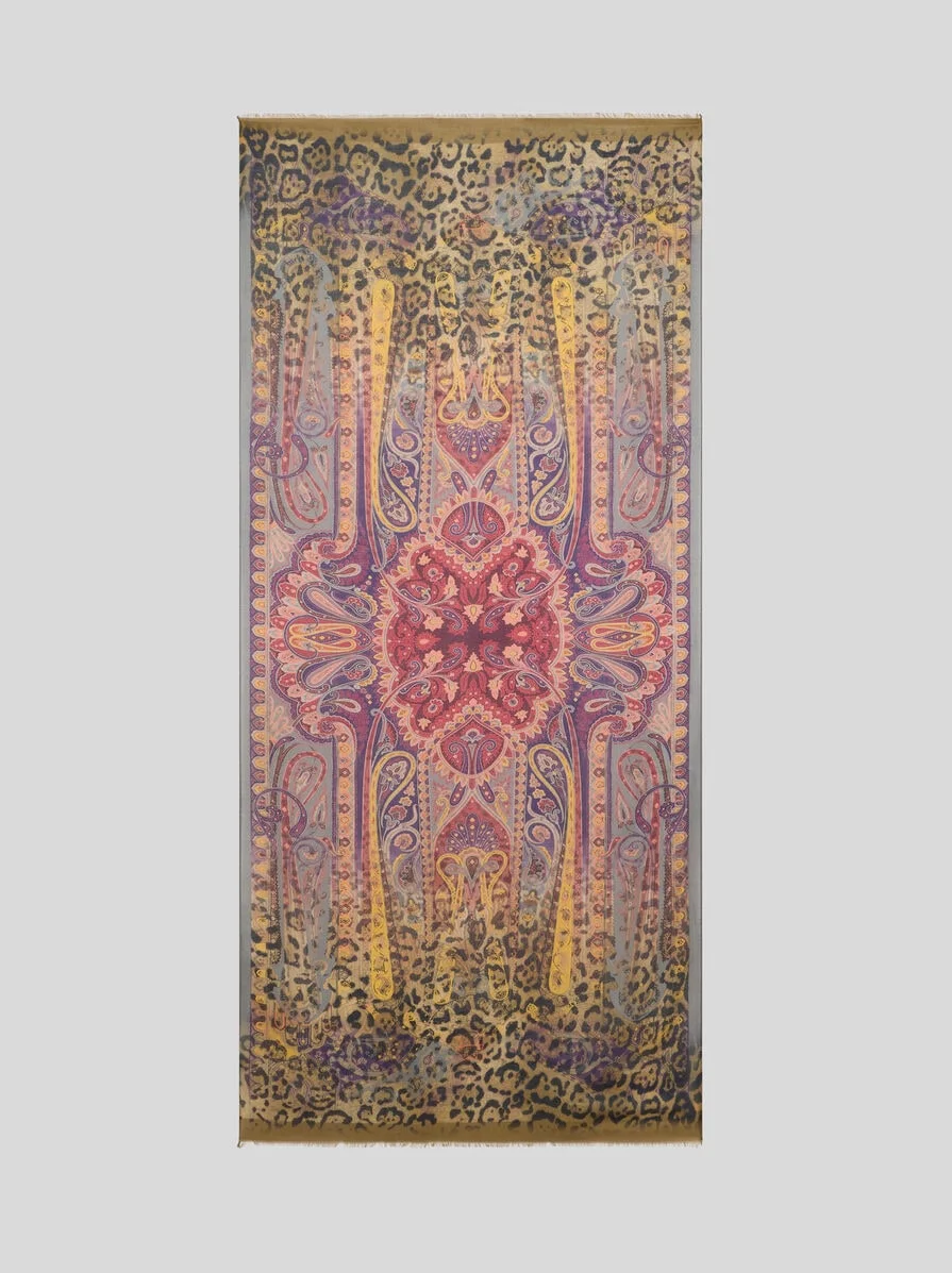 Wool- and silk-blend scarf with iconic Paisley motif accompanied by animal print that fades towards the centre. Completing the accessory are the slightly frayed short sides and an ETRO logo at the end. • Size: 27.6 x 78.7 inches (70 x 200 cm) • Made in Italy PRODUCT DETAILS • 70% wool, 30% silk