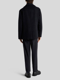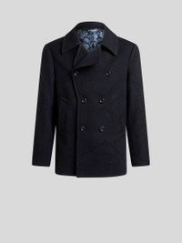 Double-breasted pure wool pea coat with tonal floral jacquard motif. This item features lining with a decorative contrasting print. • Regular fit • Double-breasted closure with buttons • Side slip pockets • Made in Serbia • The model is 6' 1½" (187 cm) tall and wears a size M PRODUCT DETAILS • 100% wool • Lining: 100% viscose