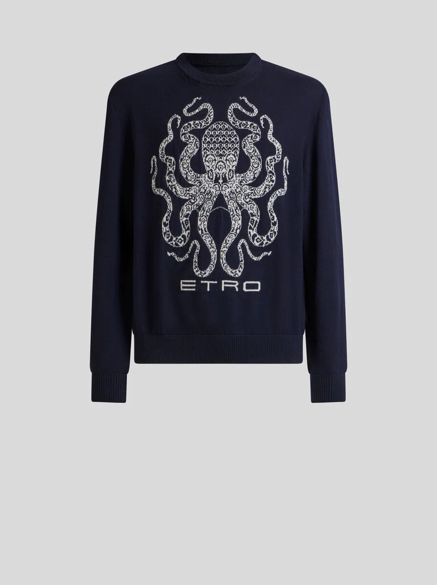 Crewneck jumper in warm wool jacquard fabric. It features a motif with an octopus accompanied by the ETRO lettering on the front. The classic ribbed detailing completes the garment. • Roma regular fit • Crewneck • Long sleeves • Ribbed edging • Made in Bulgaria • The model is 6' 1½" (187 cm) tall and wears a size M PRODUCT DETAILS • 100% wool