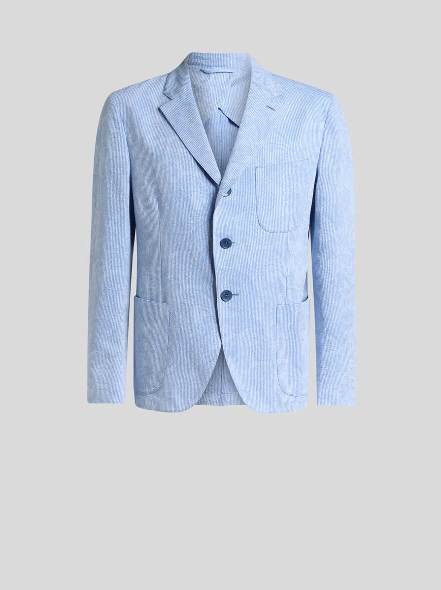 Tailored jacket in striped pure cotton seersucker fabric with distinctive floral jacquard motif featuring Paisleys. This item features three large patch pockets on the front and is complete with a single-breasted closure with logo-branded buttons. • Regular fit • Single-breasted three-button closure • Three front patch pockets • Made in Italy • The model is 6' 1" (186 cm) tall and wears a size 48 PRODUCT DETAILS • Exterior: 100% cotton • Lining: 52% viscose, 48% acetate